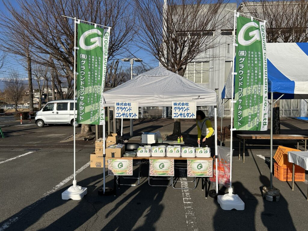当社は会場内にブースを出展し、寒さ対策としてカイロの無料配布を行いました。多くの皆さまにお立ち寄りいただき、地域の皆さまと直接交流できる貴重な機会となりました。